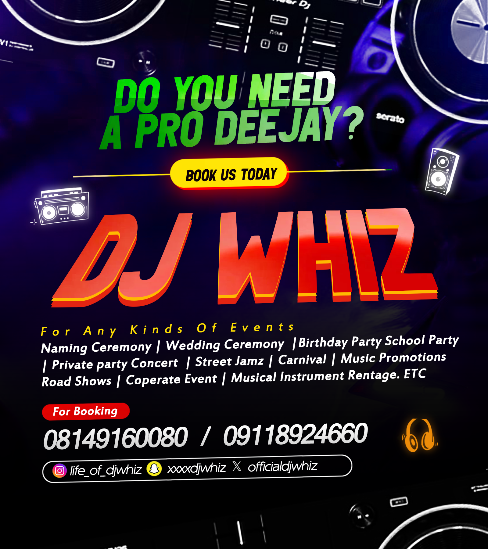 Beatwhiz Solutions is a dynamic entertainment company specializing in DJ services, event management, and artist promotion. We bring events to life with high-energy music, seamless coordination, and a deep passion for creating memorable experiences.